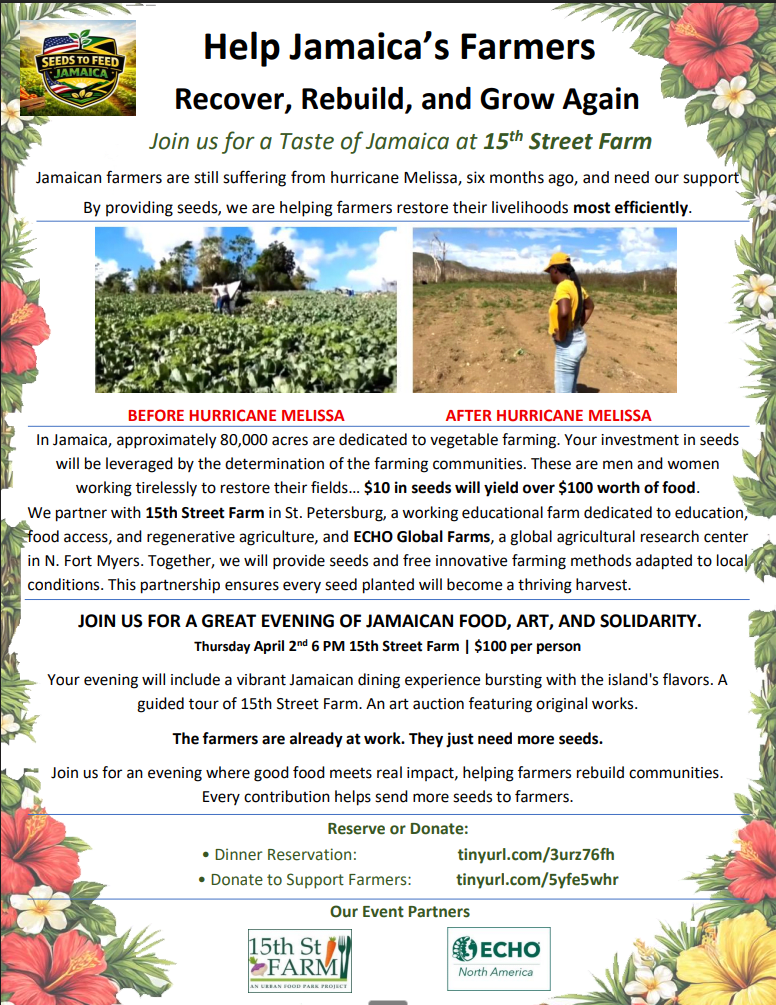 We are hosting a community dinner to support Jamaican farmers still recovering from the devastation of Hurricane Melissa last October. Our focus is simple and practical: providing seeds, giving farmers the fastest path to replant, rebuild, and restore their livelihoods. Six months later, many fields remain damaged, crops have been lost, and livelihoods shaken, but hope is growing.