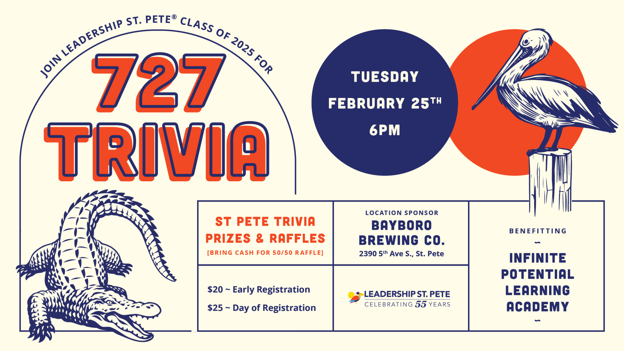 Think you know St. Pete? Put it to the test! We’re hosting 727 Trivia at Bayboro Brewing Co. on Tuesday, February 25th, to raise funds for the LSP Class of 2025 Community Project benefitting Infinite Potential Learning Academy here in sunny St. Pete. We’re throwing it back old school, so feel free to dress in your best retro gear for an extra pop of fun!