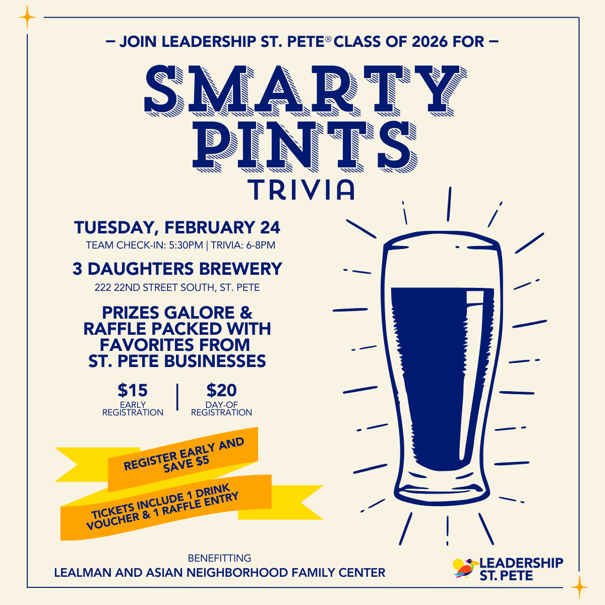 Leadership St. Pete® is proud to partner with local nonprofits to raise funds, lend expertise, and collectively provide hands-on help for a large-scale project. This year, our class is honored to partner with Lealman and Asian Neighborhood Family Center (LANFC), where we’ll build a new bridge and expand outdoor spaces for their youth. This trivia event is our first public fundraising event as we work toward our goal of raising $50,000.