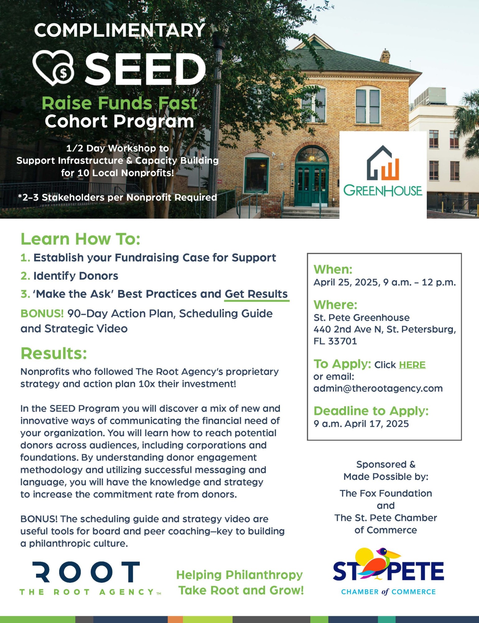 The Root Agency is offering a COMPLIMENTARY ½ day workshop for up to 10 nonprofits at the @ St. Pete Greenhouse April 25 from 9 a.m. – 12 pm!!!