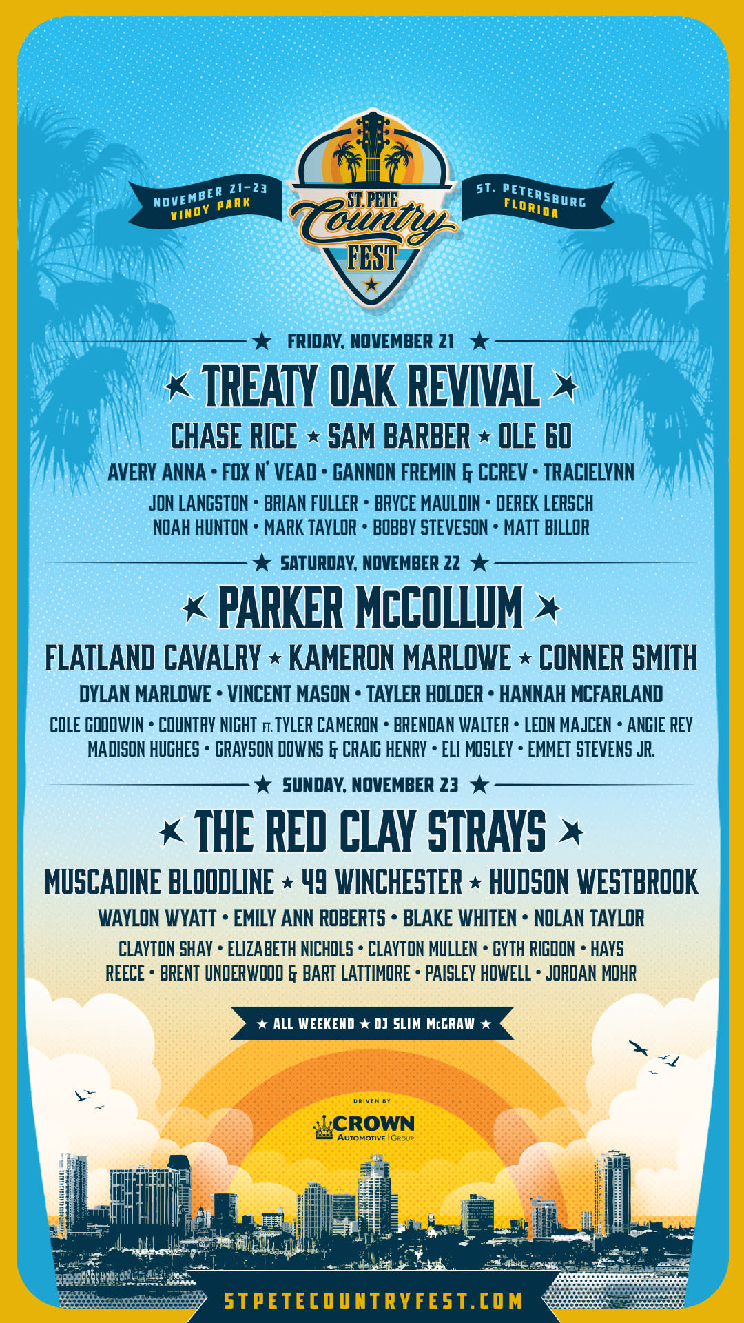 Join us at St. Pete Country Fest 2025 – 3 full days of the best country music at the iconic Vinoy Park in St. Petersburg, Florida featuring Parker McCollum, The Red Clay Strays, Treaty Oak Revival, & more.