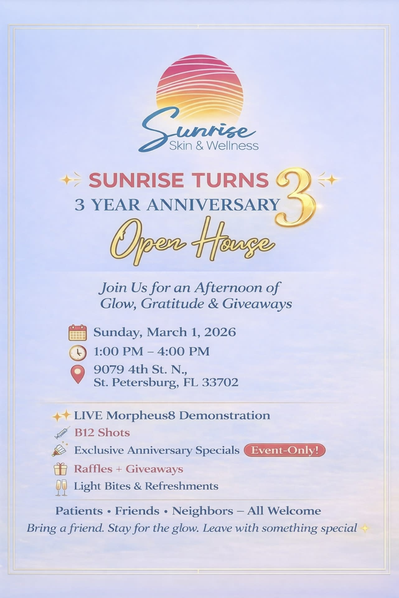 #SunriseSkinAndWellness #StPeteEvents #StPeteWellness #AnniversaryOpenHouse #GratefulHeart #SupportLocalStPete #WellnessCommunity