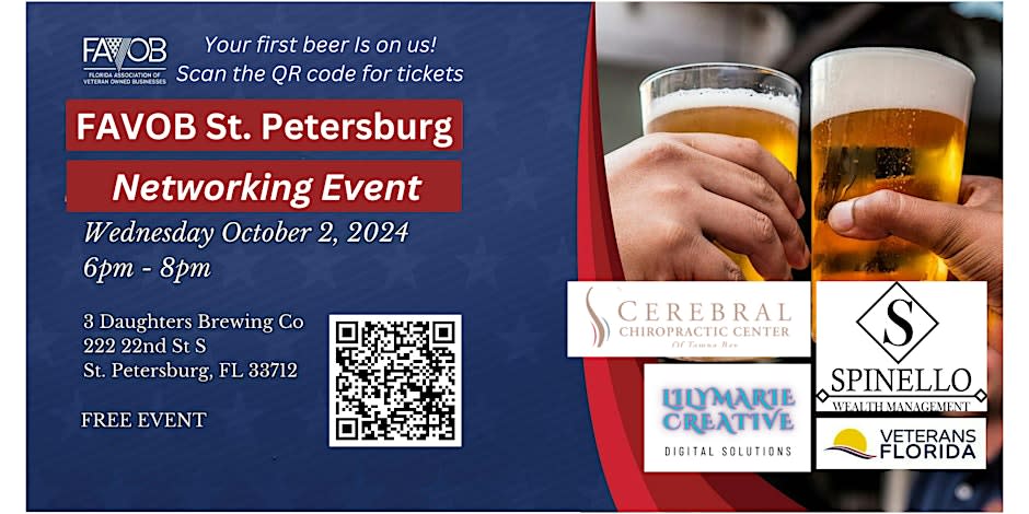 Join us for a free networking event for Veterans and Veteran Business Owners at 3 Daughters Brewery. This event is put on through FAVOB (Florida Association of Veteran Owned Businesses). Come network, meet other veteran business owners and professionals across many fields, and grow your network of business. Introduce your business and what clients you are looking for. Please bring business cards to share. Connect, grow, and have a great time. Do business with the best!