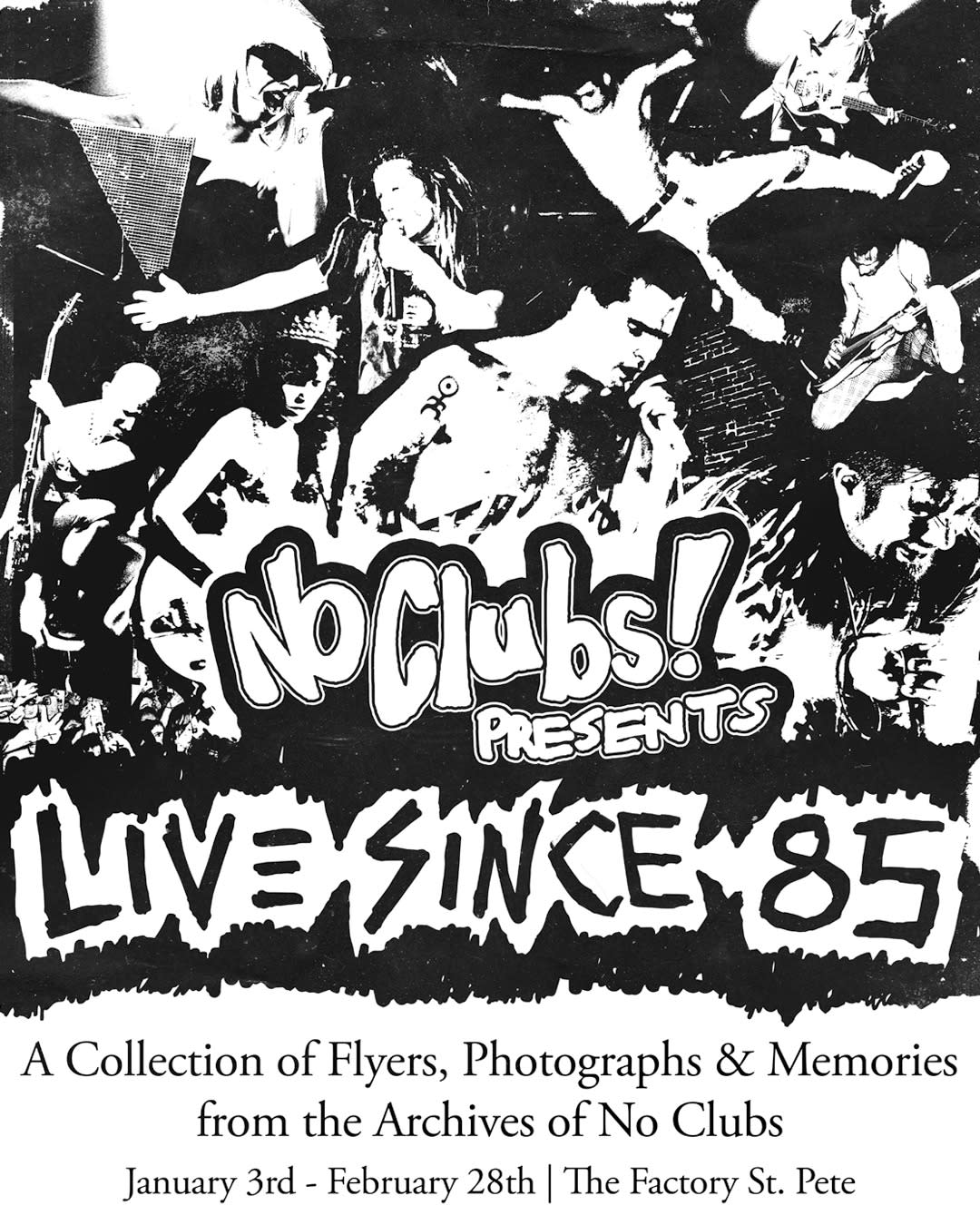 pening Jan. 3 at The Factory St. Pete, the exhibit showcases four decades of No Clubs’ concert posters, flyers and photos that shaped Tampa Bay’s music scene.